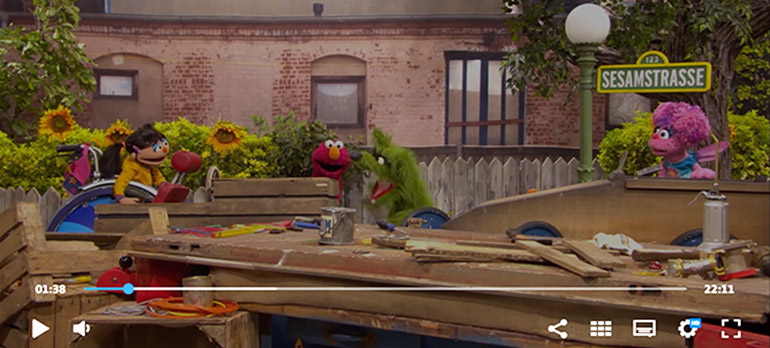 Seit Rollstuhlfahrerin Elin in der Sesamstraße eingezogen ist, geht es dort noch inklusiver zu. Im Herbst 2023 baut sie zusammen mit Elmo an einer Seifenkiste, die einem Handbike recht ähnlich ist.