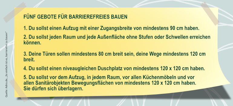 Barrierefrei zu bauen ist deutlich einfacher, als die meisten denken. Finden zumindest die Macher von adira.de, einer Internetplattform für barrierefreien und rollstuhlgerechten Wohnraum – und haben die dicke DIN 18040-2 mit all ihren Detailbestimmungen auf fünf knackige Gebote zusammenschnurren lassen.