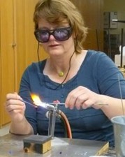 Es riecht ein bisschen nach Propangas, das zusammen mit Sauerstoff einen veilchenblauen Strahl vor dem Brenner bildet. In der Flamme wärmt Andrea Streit mit der rechten Hand die Spitze einer violetten Glasstange. In der anderen Hand hält sie den Dorn, ein beschichtetes Metallstäbchen. Sobald das Glas glüht, wickelt die 47-Jährige die zähe Masse auf den Dorn. Dazu dreht sie das Stäbchen zwischen Daumen und Zeigefinger langsam hin und her. Die Flamme zischt leise vor sich hin, während die Perle ihre Form annimmt. Je gleichmäßiger Andrea Streit den Dorn dreht, umso runder wird die Perle. Jetzt ist sie so heiß, dass sie später mindestens drei Stunden braucht, um abzukühlen und ihre endgültige Farbe zu zeigen.