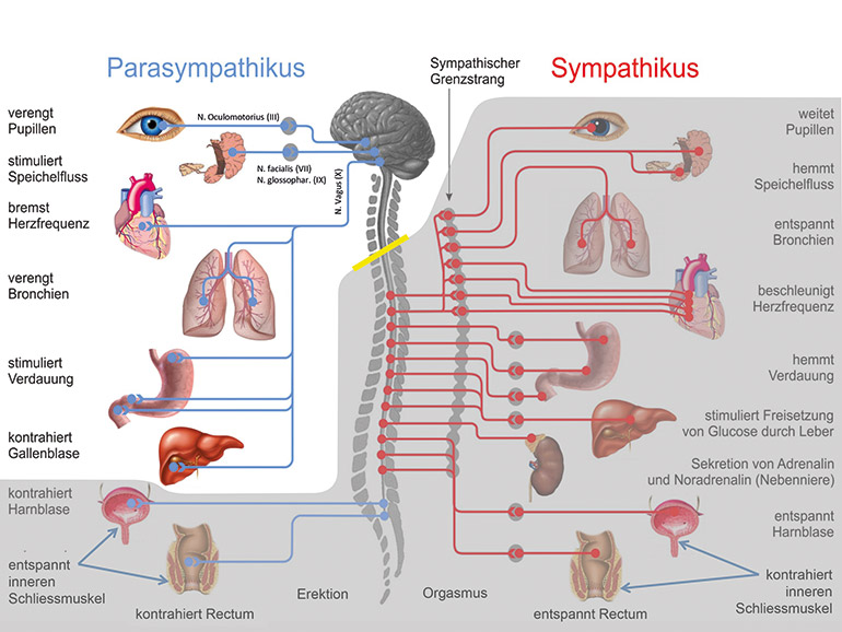 „Praktisch alle inneren Organe werden von beiden Teilen des autonomen Systems versorgt, die je nach Organ eine aktivierende oder bremsende Funktion ausüben.“