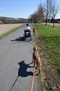 Vorsorglich hat sie sich in ihren „Räuberrollstuhl“ schon eine Hinterradbremse einbauen lassen – für und mit den anderen Hunden genügte eine Vorderradbremse. Dazu kommen breitere Reifen, breite Felgen und eine verstärkte Kupplung. Alles ist startklar für das Dogtrekking mit Ikarus.