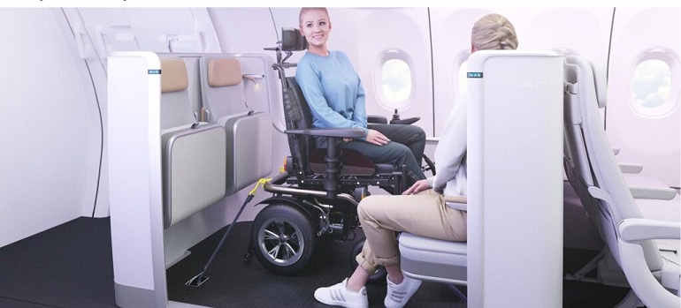 Das patentierte Design sieht vor, dass die Kopfstütze, die Ablagetische in der Mittelkonsole und die Armlehnen so eingestellt werden können, dass auch Passagiere mit Elektrorollstühlen Platz finden.
