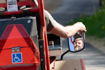 Nach erledigter Arbeit fährt Markus Buser zurück, stellt den Mäher routiniert ab und wechselt in seinen Rollstuhl. Der 29-Jährige lächelt zufrieden: „Wenn ich nicht mehr in der Landwirtschaft tätig sein könnte, würde ich versauern.“