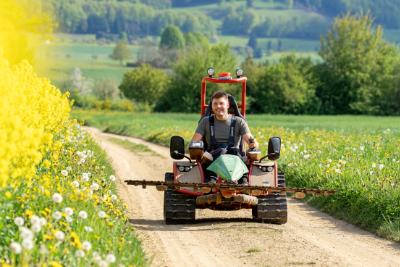 Der Weg führt vorbei an Rapsfeldern, die im leuchtenden Gelb zum sonnigen Tag passen. Markus Buser tuckert mit seinem Mäher über ein Landstück und stutzt das Gras. Bahn für Bahn.