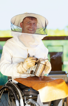 Und dann gibt es diese kleine Holzhütte: das rollstuhlgängige Bienenhaus, sein Revier. Schon während seiner Zeit bei ParaWork in Nottwil fertigte Markus Buser die Skizzen dazu an, später setzte er sie mit der Familie um. Er kümmert sich sorgfältig und mit Leidenschaft um seine Bienenvölker. Wenn er die Schutzkleider übergestülpt hat, blende er seine Querschnittlähmung komplett aus: „Jeder auf dem Hof hat seine Aufgabe. Und für mich war klar, dass der Rollstuhl mich nicht am Imkern hindern kann.“