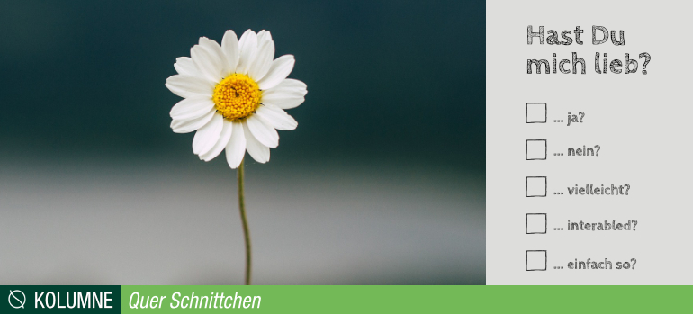 Quer Schnittchen ist eine fiktive Figur. Die Kolumnenbeiträge sind inspiriert von Gesprächen der Redaktion mit querschnittgelähmten Menschen. Alltagstipps, eine witzige Begebenheit, eine emotionale Begegnung, eine ärgerliche, aber typische Situation: Was die Leserschaft von Der-Querschnitt.de beschäftigt, greifen die Redakteurinnen gerne an dieser Stelle auf.