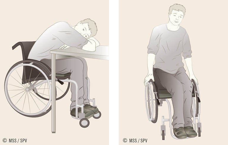 Tetraplegiker können keine so extreme Seitwärtsneigung wie Paraplegiker ausführen. Bei einer leichten Neigung zur Seite haken den Arm am besten hinter dem Schiebegriff an der Rückseite des Rollstuhls ein.
