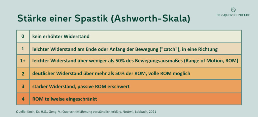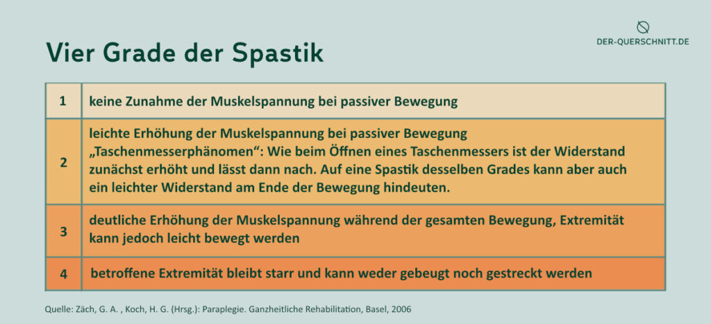 In Anlehnung an die Stufen der Skala können die Grade einer Spastik bei Querschnittlähmung auch folgendermaßen beschrieben werden (Zäch/Koch, 2006):