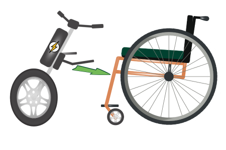 Auch durch abnehmbare Rollstuhl-Schubgeräte erhält ein manueller Rollstuhl einen Motor, ohne dass nennenswerte Änderungen am Hilfsmittel vorgenommen werden müssen. Sie treiben den Rollstuhl mit einem Elektromotor und eigenen Rädern an.